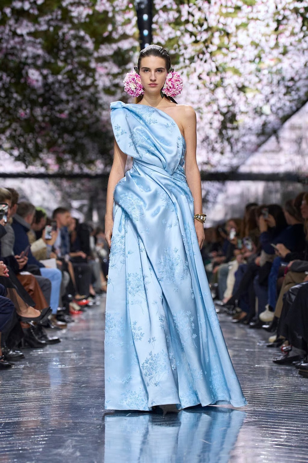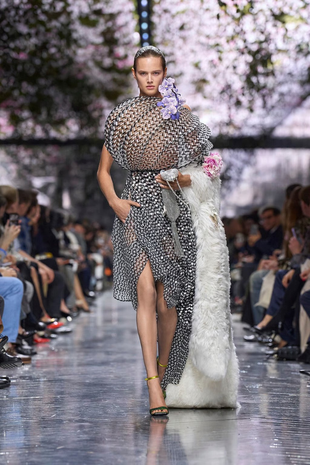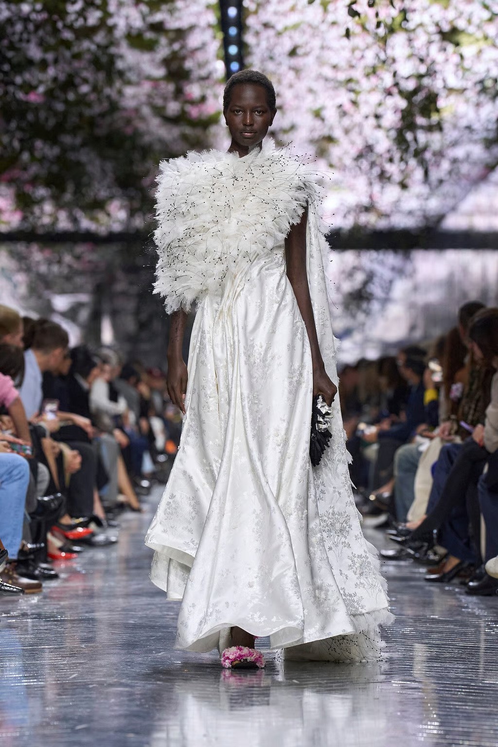 The collection itself unfolded like a Wunderkammer – a cabinet of curiosities – of Dior’s past and future treasures. Anderson’s fascination with objects marked by time was evident in the incorporation of 18th-century textiles, upcycled into new gowns and accessories, such as pannier-skirted dresses that hinted at Dior’s New Look silhouette and were crafted from antique brocades. Tiny vintage cameo miniatures sourced from auctions became jewelled brooches and adornments for garments. Fragments of actual meteorites and fossils were set into cuff bracelets and rings, bringing cosmic antiquity into the couture parlour. Anderson spun these elements together with masterful lightness. Models emerged in sculptural silk dresses with pleated, bulbous hems tied like blossoms at the knee, inspired by a vase form of his collaborator Magdalene Odundo. There were pieces with tulle that provided a stitched armature for rounded silhouettes; pieces with netting that functioned as a veil over inflated proportions; shredded chiffon and organza that built up in thin layers for texture; and cyclamen motifs that appeared as sculpted silk applications and delicate embroidery extending onto jewelry and shoes. In palette and mood, the collection was like dawn in an imaginary garden: soft petal pinks, moss greens, sky blues, punctuated by the black-and-white of shadows and light. Anderson even nodded to Christian Dior’s own love of gardening by referencing the iconic “flower women” of the house, reinterpreted via knit cocoon capes and bell-shaped skirts that evoked blossoms in silhouette. Accessories continued the dialogue between eras, with models carrying molded handbags covered in centuries-old fabrics and embroidery, as well as surreal clutches shaped like seedpods and insect carapaces. On their feet, some wore golden slippers reimagining Dior’s classic Roger Vivier-designed square-toe shoes of the 1950s. And the couture jewelry pieces were a story unto themselves, with 18th-century portrait miniatures framed in pearls and lacquer, ornate silk ear cuffs that unfurled like literal flowers, and chunky rings made of semiprecious stones and meteorite shards, symbolizing a union of earth and sky.