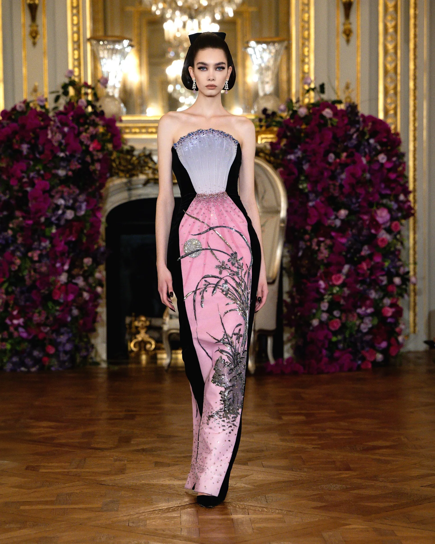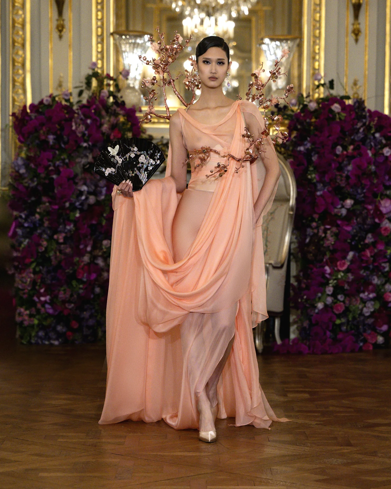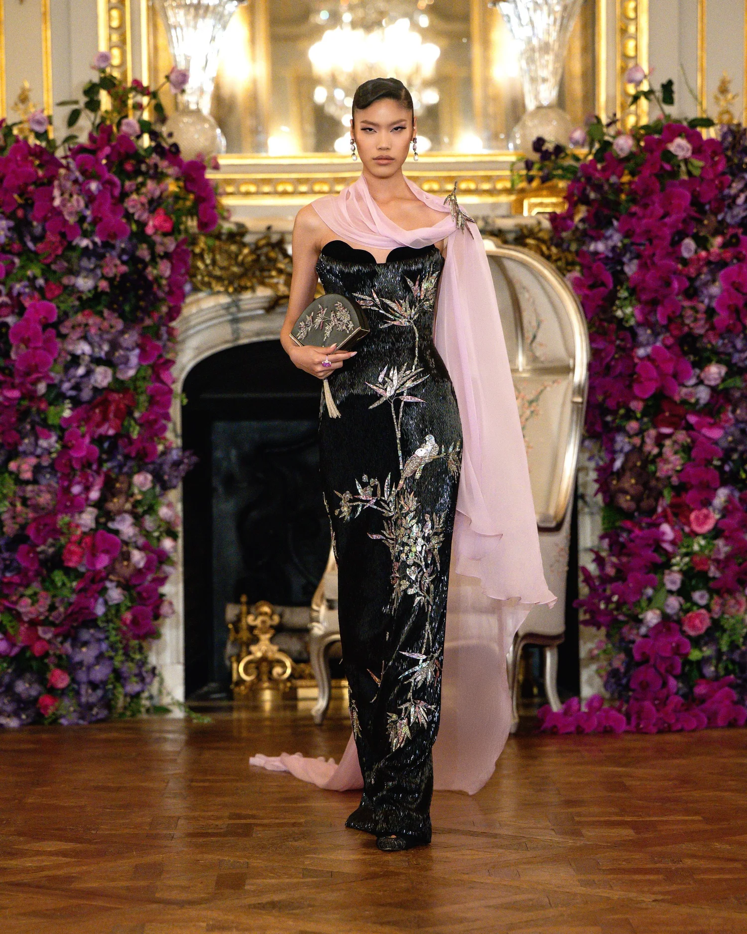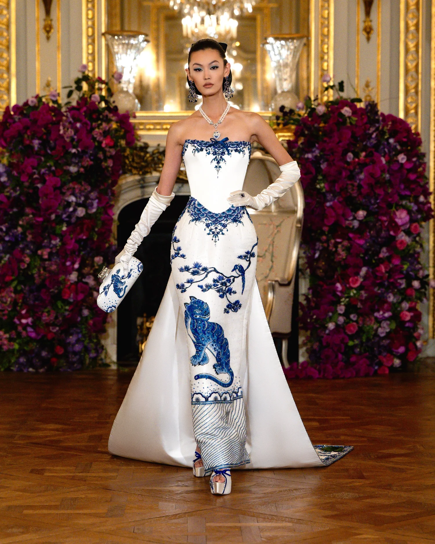 London-based couturier Sohee Park (Miss Sohee) closed the week with a collection that was equal parts dreamy homage to her Korean heritage and showcase of youthful couture prowess. For Spring/Summer 2026, she presented “Breathing Forms,” a series of thirty looks that treated the body as both structure and canvas. On the sophisticated venue the show took place in, she even sent a model down the runway carrying a white peacock as an accessory – a dramatic flourish that announced her theme of nature’s majesty and vanity (“primped and preened”). The peacock’s plumage found echoes throughout the collection, as Park worked its bright feathers and elegant motif into multiple looks. The true heart of the collection, however, lay in its meticulous depiction of Korean landscapes and lore. She drew deeply from cultural motifs such as Wisteria vines, bamboo groves, and misty mountain horizons and translated them into breathtaking embellishments on silk, organza, and taffeta. The silhouettes remained refined and close to the body (corseted bodices, columnar skirts, and only subtle flares), allowing the surface artistry to shine. Diaphanous layers of chiffon and organza were hand-painted and ombré-dyed to mimic dawn light filtering through foggy peaks, while shimmering embroideries of cranes, florals, and clouds were stacked in gauzy layers to create depth and illusion. In a particularly memorable piece, the designer wove in a reference to the Korean folk tale “Jakhodo,” with the dress featuring tiger and magpie motifs rendered in the style of Chinese Jingdezhen ceramics. And all looks brimmed with such thoughtful detail and handwork, with, for instance, one look featuring 6,700 Swarovski crystals and took 720 hours for 16 artisans to create. But despite the inherent drama of much ornamentation, the overall tone of the collection was one of measured elegance. In usual Miss Sohee fashion, it was clothing made to complement the inherent beauty of every woman, and the collection did so through stunning detailing. After a more theatrically extravagant outing last season, her Spring/Summer 2026 collection felt like a story of nature and heritage, translating narrative into couture surfaces. It was grandeur through art and craft, with each dress being a vessel of memory, landscape, and symbolism.