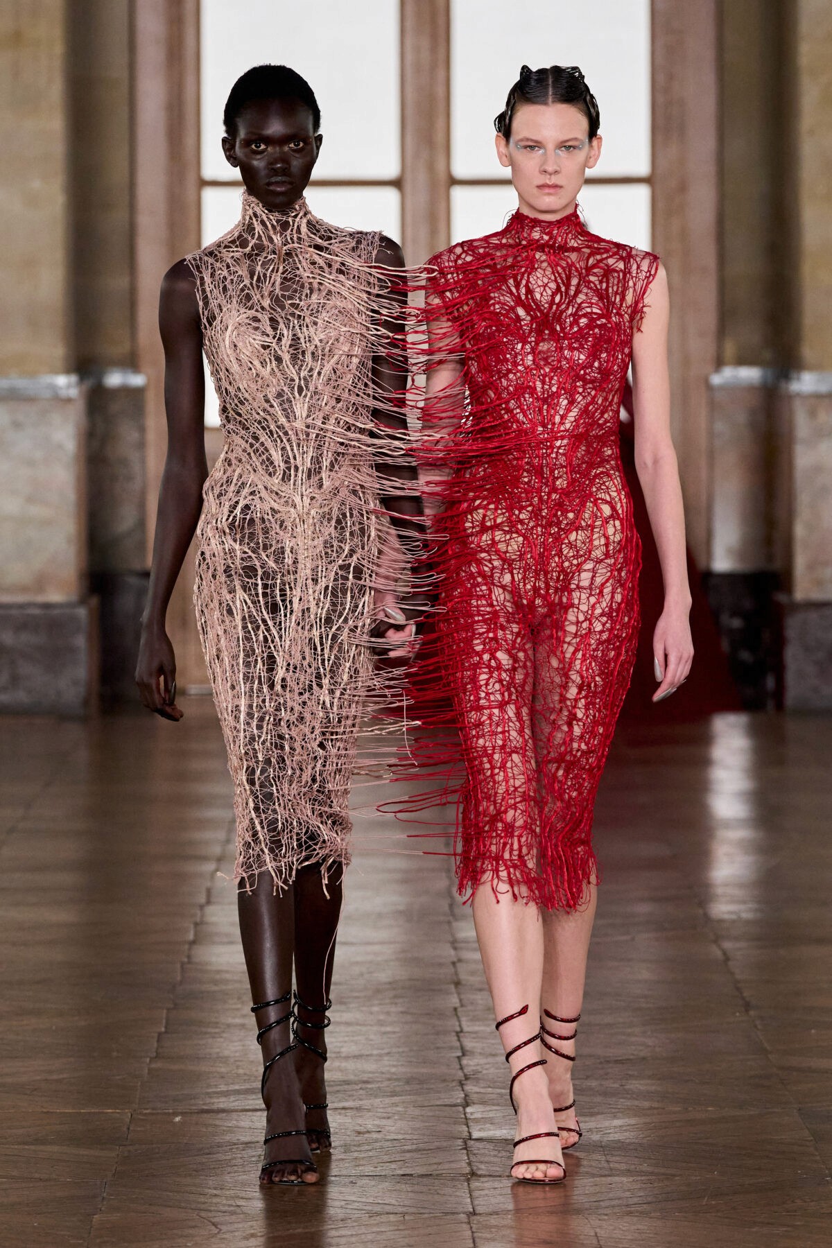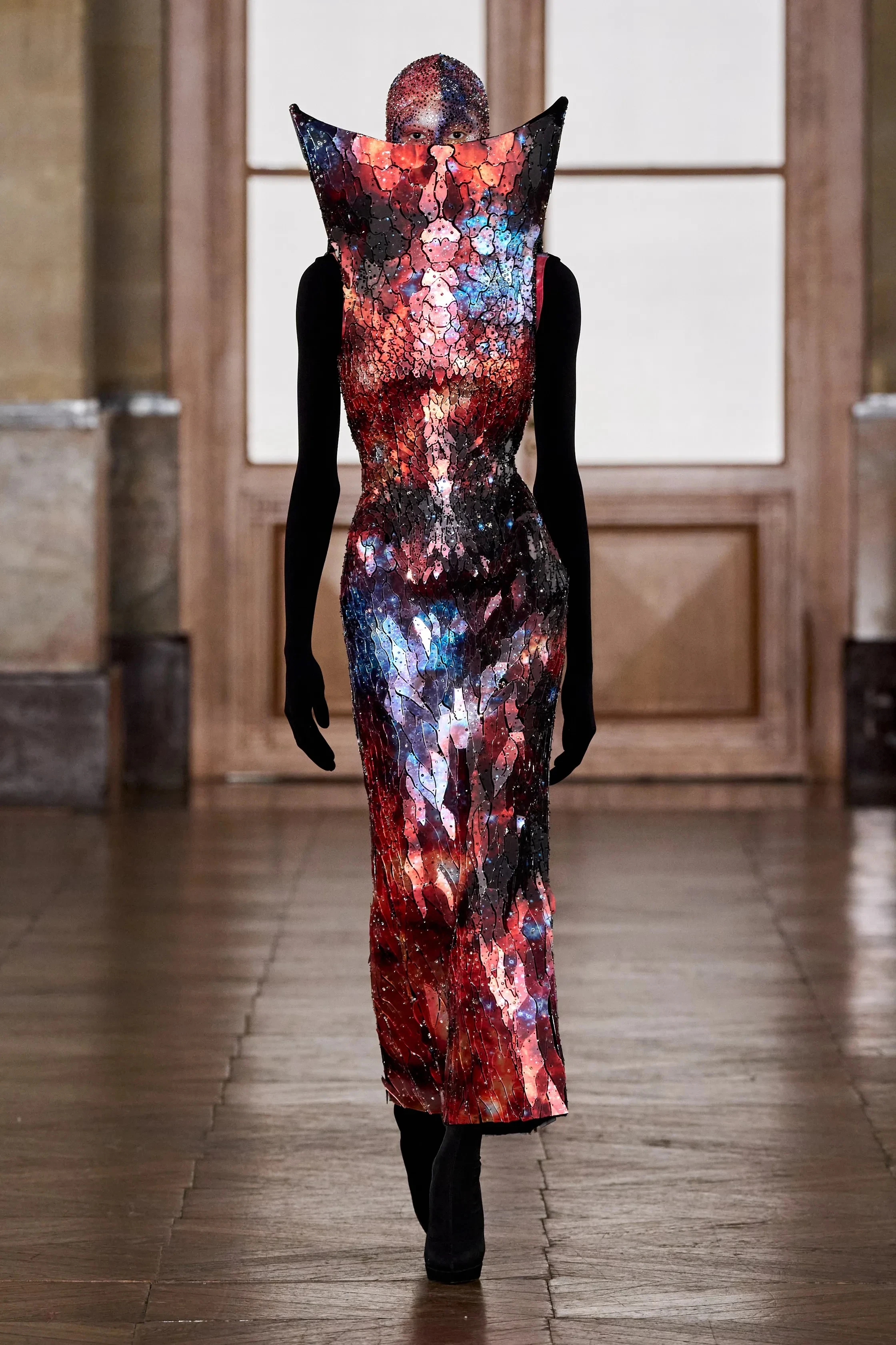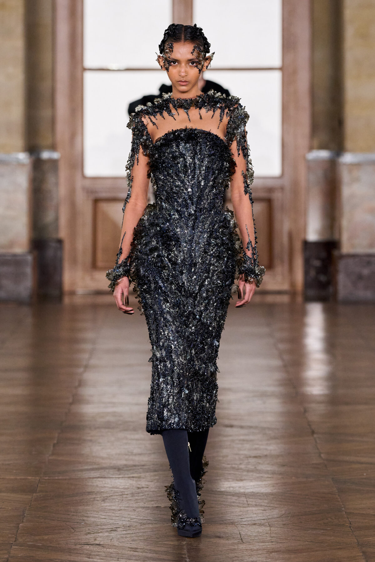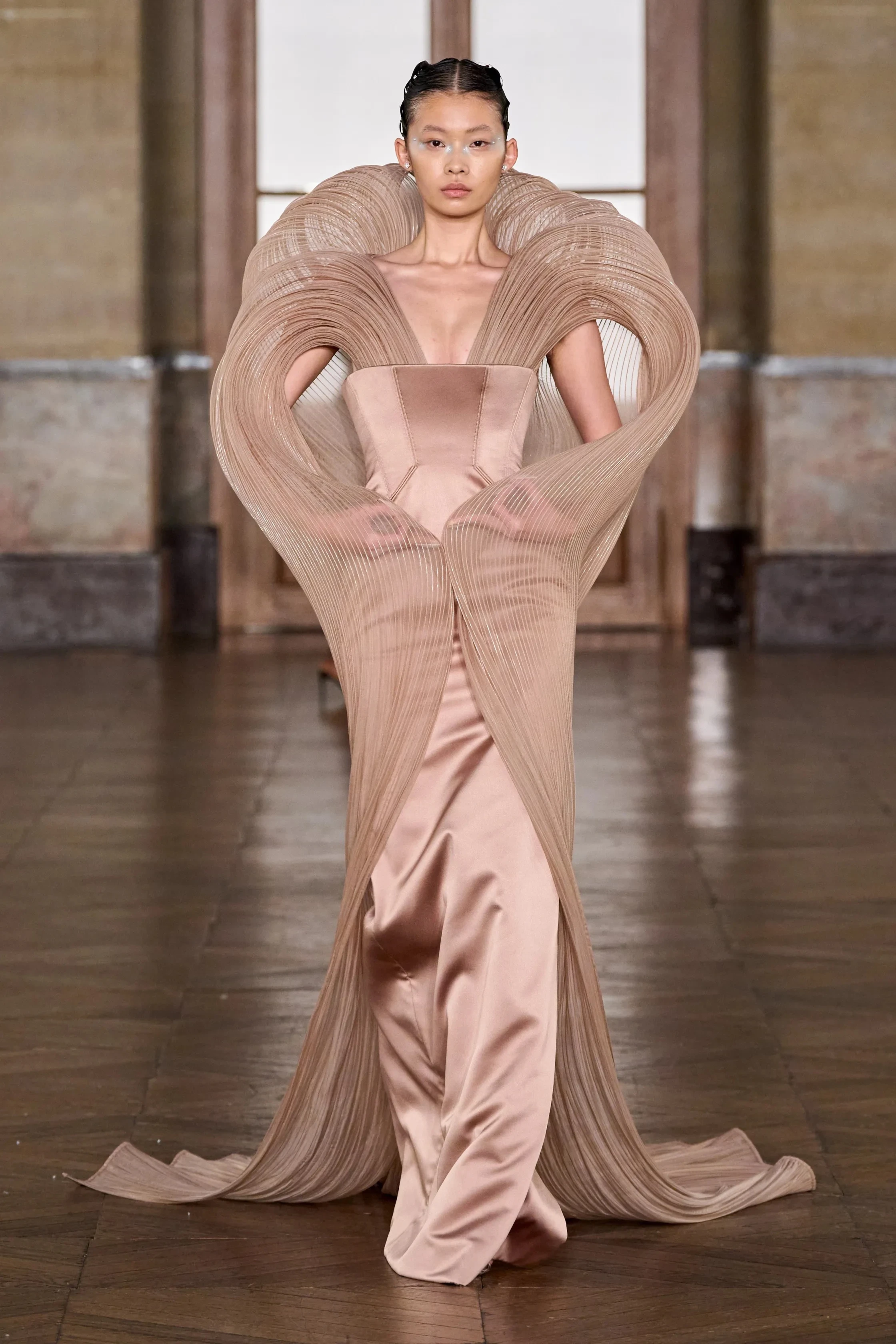 Robert Wun approached his Spring 2026 haute couture debut as a three-act opus on the emotional journey of creation. Titled “Valor: The Desire to Create, and the Courage to Carry On,” his collection channeled the trials and triumphs of the creative process. Staged at the storied Lido cabaret under rolling thunderstorm visuals, Act I (“Library”) opened with sculpted black-and-white looks inspired by Wun’s old sketchbooks, symbolizing the quiet birth of dreams. Restrained for this typically dramatic designer, these monochrome silhouettes featured precise corseted bodices, rounded bolero shoulders, and flared skirts – elegant armor for imagination. In Act II, titled “Luxury: Confrontation of Reality,” the tone shifted with models appearing as eccentric beings with molded bodices like high-jewelry displays, faces obscured by crystal-encrusted masks and adorned with gleaming diamond necklaces – very much a commentary and dialogue of clash between creative aspiration and economic reality. Wun wove humor and spectacle into the critique, sending out pointy, bright-hued corsets atop trailing skirts, and even a 40-kilogram gown fully encrusted in micro glass beads – literally a heavyweight showpiece. (The model carried this gigantic circular beaded gown with stoic grace, as if a 40-kg “wearable dumbbell” were no burden at all.) Then, when one thought what had been displayed could not be topped, Act III (“Valor”) commenced. Through avant-garde looks defined by armour and swords, Wun appeared to state that even if faced with resistance, he will protect and carry out his dreams – even if, as shown through the penultimate look, set back. And those dreams were what Wun seemed to convey through the collection’s final look: a veiled gown adorned with countless golden gemstones like a night sky full of stars, representing the beauty and infinity of one’s dreams like the universe and its endless stars. It was couture as mythmaking: armor on, storm raging, dreams intact. Wun explained that the three chapters chart the creator’s path “to be inspired, to be desired, and finally to summon the courage to move forward,” asserting that couture survives because it reflects not who we are but who we aspire to be – the dream that refuses to die. In his imaginative, quasi-poetic way, Wun made a passionate case for couture as fashion’s grand act of courage and vision.