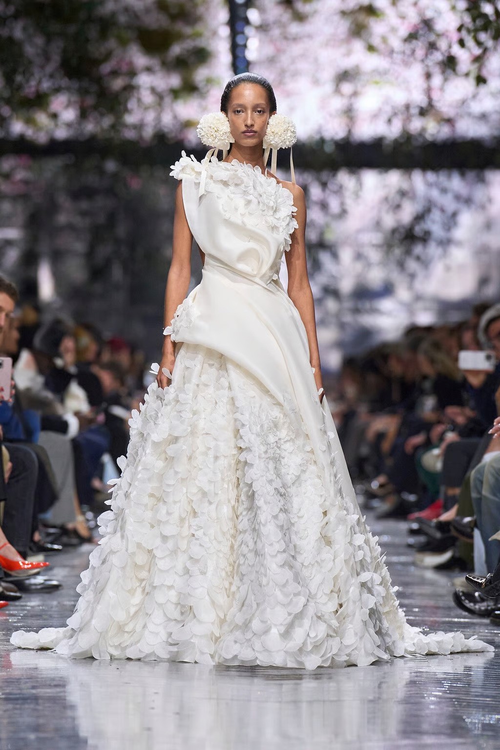 Anticipation ran high for the Dior Spring/Summer 2026 Haute Couture show, which marked Jonathan Anderson’s couture debut for the storied house. The collection was met with a spectrum of responses, yet what ultimately lingers is not its immediate impact but its cumulative effect. Rather than asserting itself through overt theatricality, Anderson’s proposal unfolds gradually, with its beauty embedded in construction, material choice, and the discipline of restraint. At first encounter, the collection may appear somewhat understated, particularly when measured against the grandeur often synonymous with haute couture. Yet it behaves less like a declaration than a living thing. With time, through subsequent viewings, its logic begins to assert itself; details and craftsmanship emerge like petals coming into bloom. In this sense, the collection operates as a slow-burning meditation on nature, craft, and continuity, inviting reflection rather than demanding awe. Turning to the show itself, Jonathan Anderson transformed the Musée Rodin venue into an immersive botanical dream, with guests walking beneath a literal hanging meadow of cyclamen and moss suspended from the ceiling, their fragrance filling a mirrored “greenhouse” runway. This choice of cyclamen was deeply symbolic. As Anderson revealed, John Galliano had gifted him wild cyclamen posies as a good-luck charm, a poetic baton of creative continuity passing the Dior legacy to a new generation. In the show notes, Anderson wrote, “When you copy nature, you always learn something… Nature offers no fixed conclusions, only systems in motion – evolving, adapting, and enduring. Haute Couture belongs to this same lineage. It is a laboratory of ideas, where experimentation is inseparable from craft, and time-honored techniques are not preserved as relics but activated as living knowledge.”